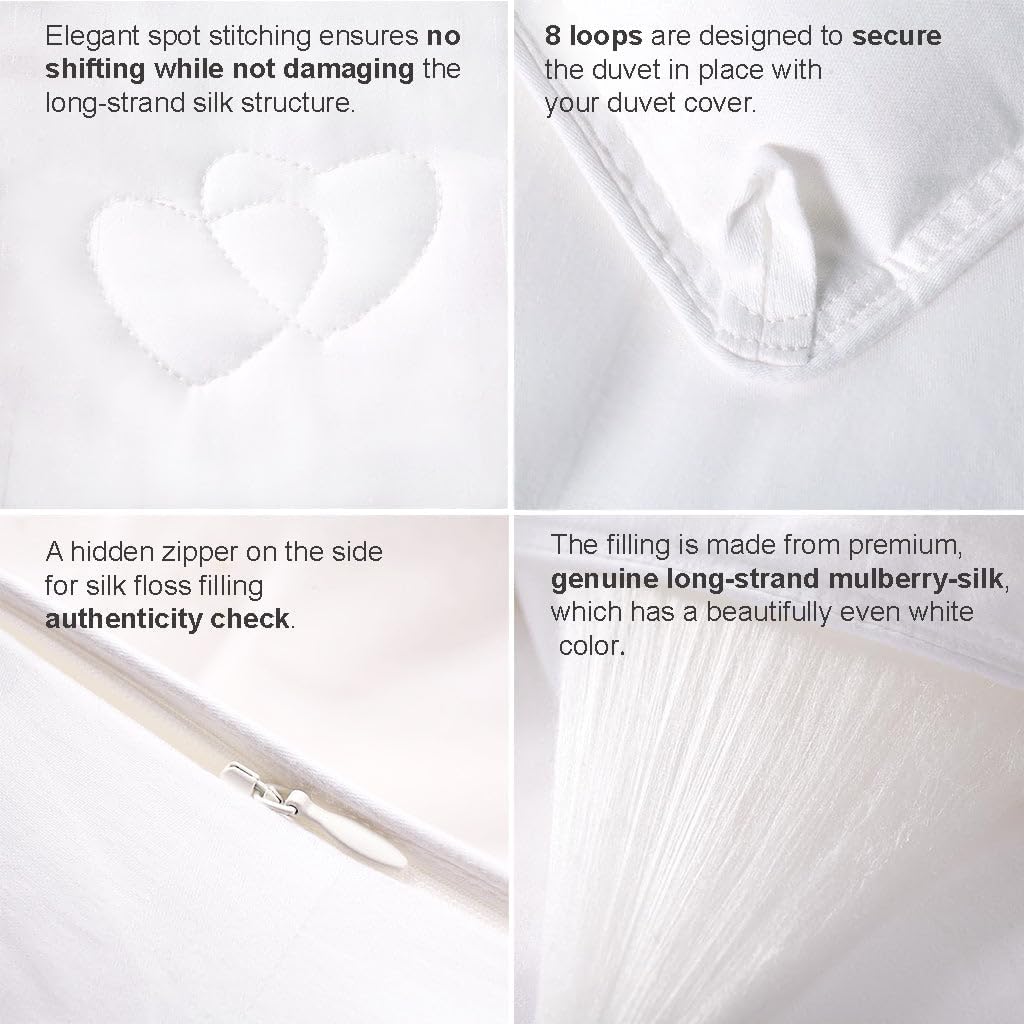 - [BENEFITS] The body-hugging nature of the mulberry-silk strands, coupled with their temperature-regulating properties, ensures a restful slumber like no other. The duvet’s ultra soft and breathable texture enhances your comfort throughout the night. Moreover, its hypoallergenic feature guarantees the safety and comfort of both you and your loved ones. Once you try this luxurious duvet insert, filled with soft, long-strand mulberry-silk, you’ll never want to go back to any other option.